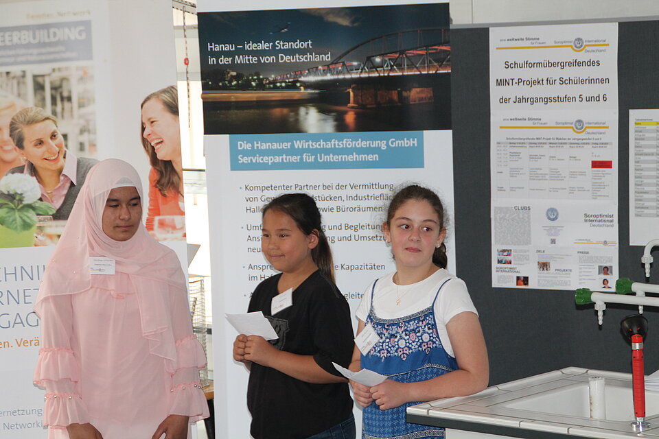 eine Woche Naturwissenschaften, Technik und dann noch Bewerbertraining? Kann das gut gehen und Spaß machen? Es kann! 24 Mädchen der 7 und 8 Klassen aus 7 Schulen haben das diesjährige MINT Projekt des Soroptimist Club Hanau unter der Schirmherrschaft der Stadtverordnetenvorsteherin Beate Funck erfolgreich absolviert. Die Abschlusspräsentation am Freitag dem 14.06.2019 war eine spannende Reise vom Thema Klimawandel, den Alternativen einer weggeworfenen Plastikflasche über den Ozeanmüll und den Fischmagen bis wieder in den Menschenmagen oder der bessere Alternative über die Recyclingtonne bis hin in ein neues stylisches Produkt. Einen ganzen Tag bei Evonik verbringen, zu erfahren, wofür Evonik steht, was die Auszubildenden dort machen, welche Perspektiven man vielleicht selber hat, im Labor zu experimentieren und gar einen kleinen Schaltkreis, einen heißen Draht, selber zu bauen? Das war cool und während des MINT Projektes kein Problem. Selbst das Thema Bewerbungen schreiben und Bewerbertraining wurde angegangen. Was geht, was geht nicht, worauf legt der Arbeitgeber Wert, was darf er fragen, wie gestalte ich Anschreiben, Lebenslauf und Bewerbung? Und last but not least, wie die Hausherrin und Hola – Schulleiterin Frau Schätzke feststellte „Ihr sitzt jetzt ja alle gemischt, habt Ihr Euch gut verstanden?“ „Na klar“ Natürlich, denn so ganz nebenbei bekommen die jungen Mädchen noch jede Menge Sozialkompetenz mit vermittelt und lernen sich über die Schulen hinweg kennen.